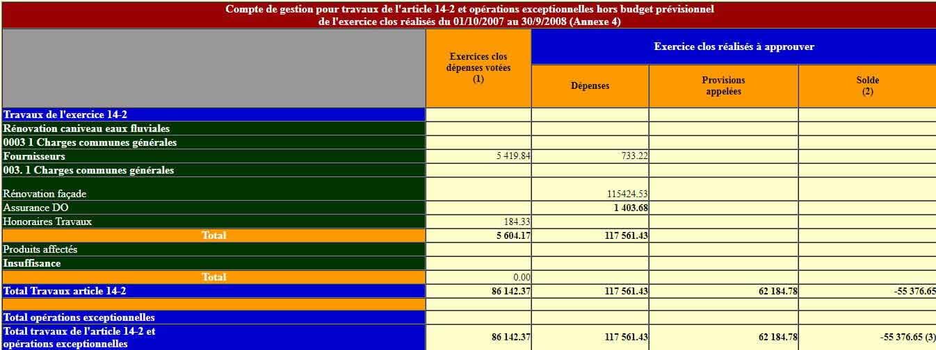 (2) : La colonne solde montre en positif les appels de fonds et en négatif les dépenses engagées (et pas forcément payées) au cours de l'exercice. Notons que l'encaissement d'emprunt vient en déduction des dépenses.